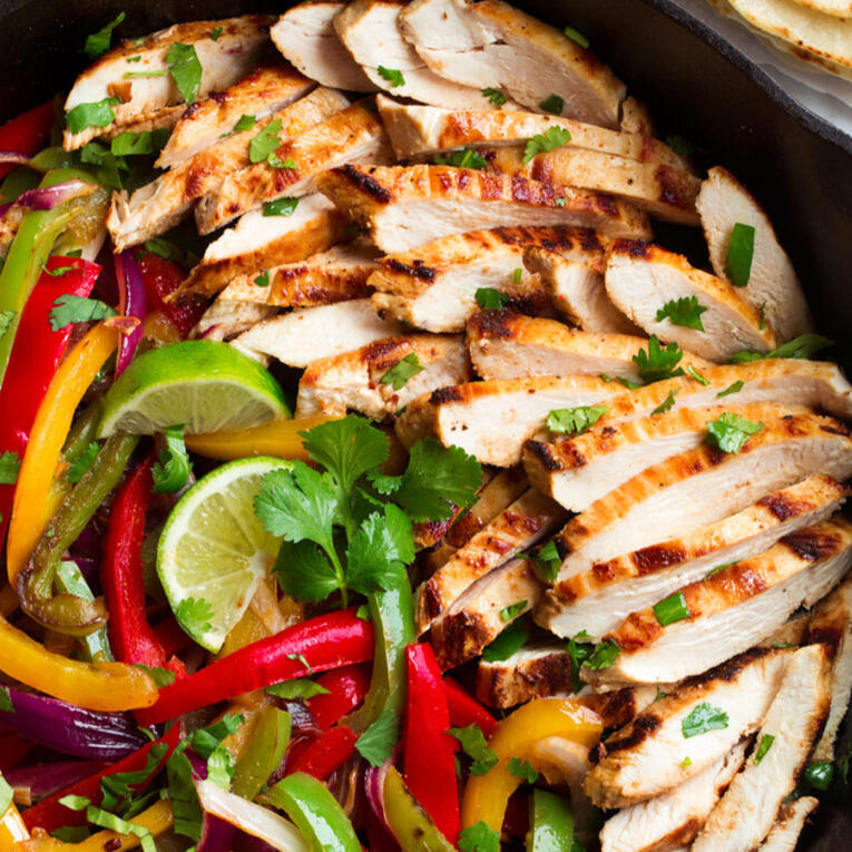 Chicken Fajitas - Tasty chicken breast with seasoned peppers, onions, and Spanish rice.